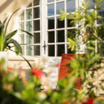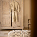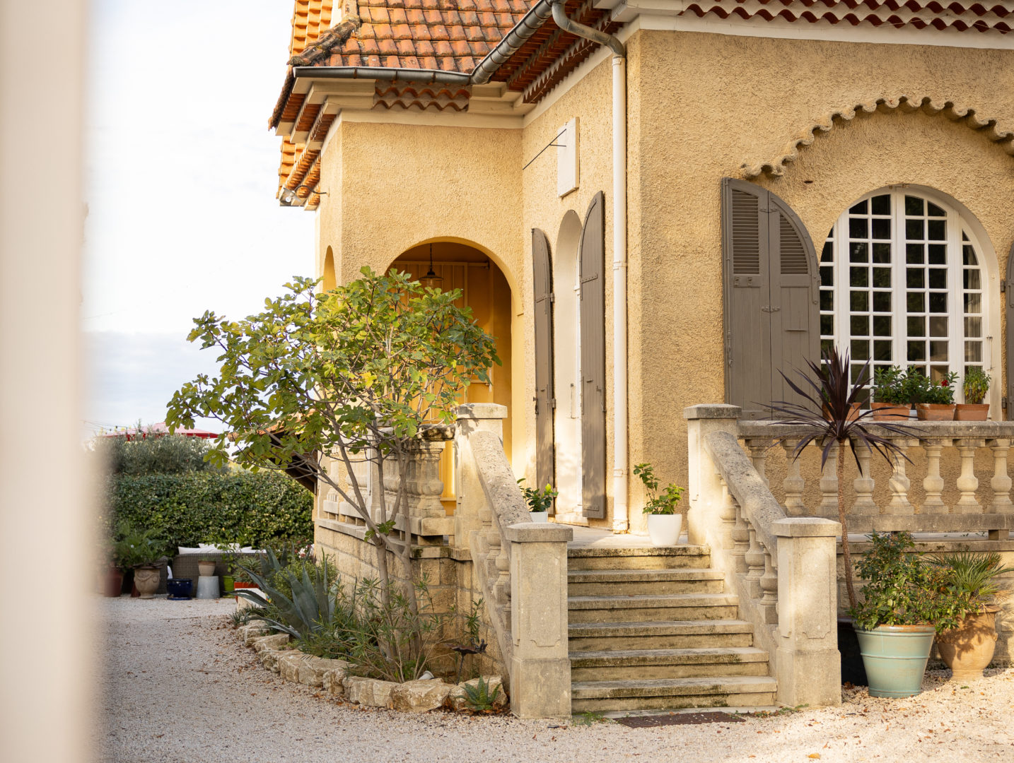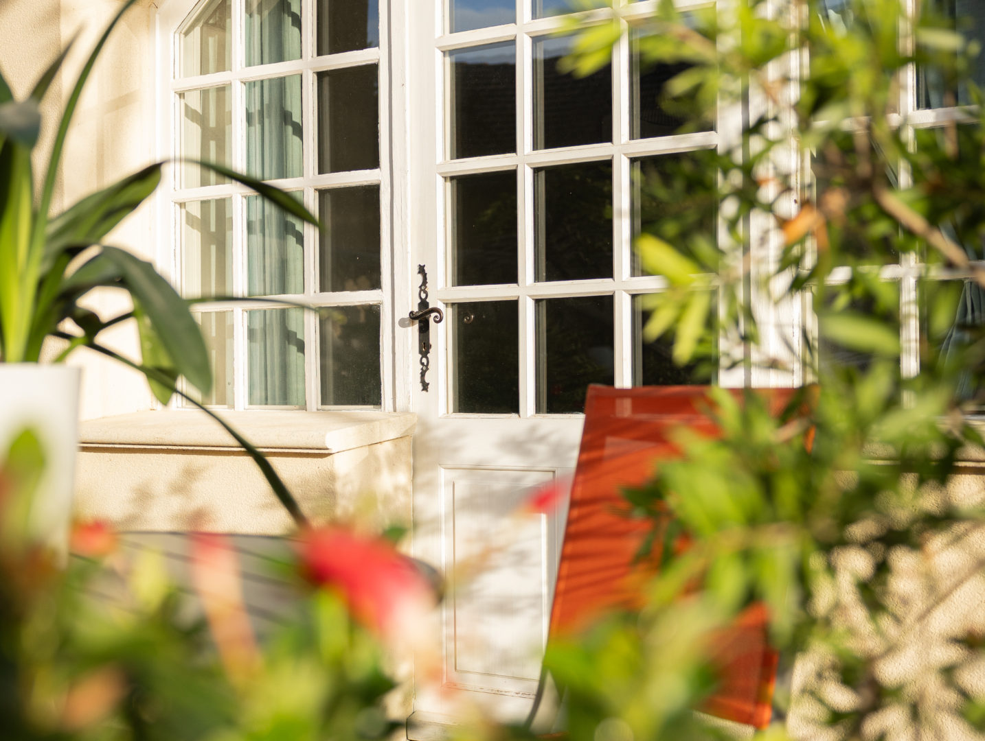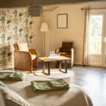 une terrasse privée avec vue sur le jardin et la piscine. La chambre est décorée dans un style “brocante-chic”.